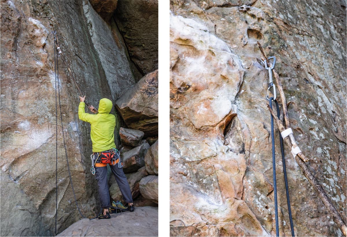 Bereits gestern sind uns die vielen Leute mit ihren Clipsticks aufgefallen. So heißen diese langen Stäbe, die dafür benutzt werden, den (oder die) ersten Haken von unten einzuhängen. Von Zuhause sind wir meist höhere "erste Haken" aus der Fränkischen oder der Pfalz gewohnt und "verhöhnen" den Trend per se in allen Routen "vorzuklippen". Doch bei dieser Tour greifen auch wir zum Hilfsmittel und genehmigen uns die Ausnahme: Sicherheit vor Tradition. Wenn dann natürlich noch auf old-school Art mit einem langem Ast, anstatt mit einem dieser modernen Teleskopstecken. 😁